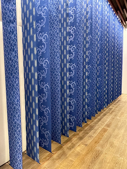 これまでも日本の文化・伝統を表現する取組をしてきました。まず久留米シティプラザ3F久留米座のホワイエに久留米絣のバーチカルブラインド。これは現在も久留米座の入口を飾っています。2つ目が資生堂久留米工場エントランスのタペストリ。これも久留米絣をデザインしたもので、弊社が直接、納品致しました。自社で企画する「ファブレス企業」としての取組も「流麗」が3点目となりました。日本の伝統文化を表現しながら現在のライフスタイルに取り入れてもらえるような商品作りがようやく出来て来つつあるかな、と思っています。